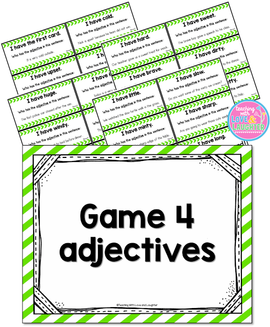 When the student with the first card shown above reads his card, the student with the second card shown above may think he has the next card in the progression because his card says, "I have candy." However, candy is not an adjective.